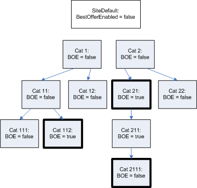 Note that if you set CategoryID to 2111, the response for that category will not include BestOfferEnabled information because it is the same as the site default. However, if you set CategoryID to 21, both 21 and 2111 will contain BestOfferEnabled settings: 21 overrides the site default and 2111 overrides the setting inherited from its parent (211).